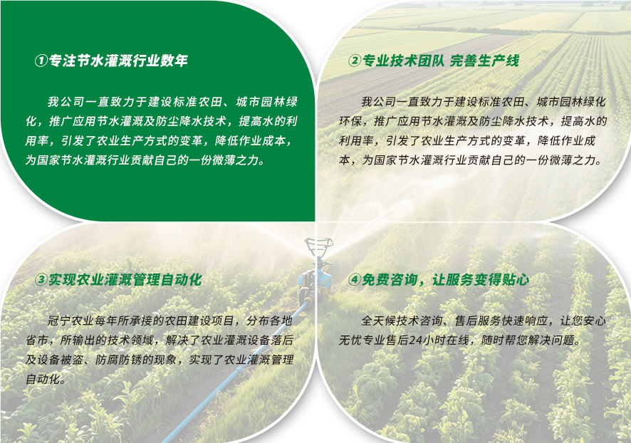 专注节水灌溉行业数年 / 专业技术团队完善生产线 / 实现农业灌溉管理自动化 / 免费咨询,让服务变得贴心