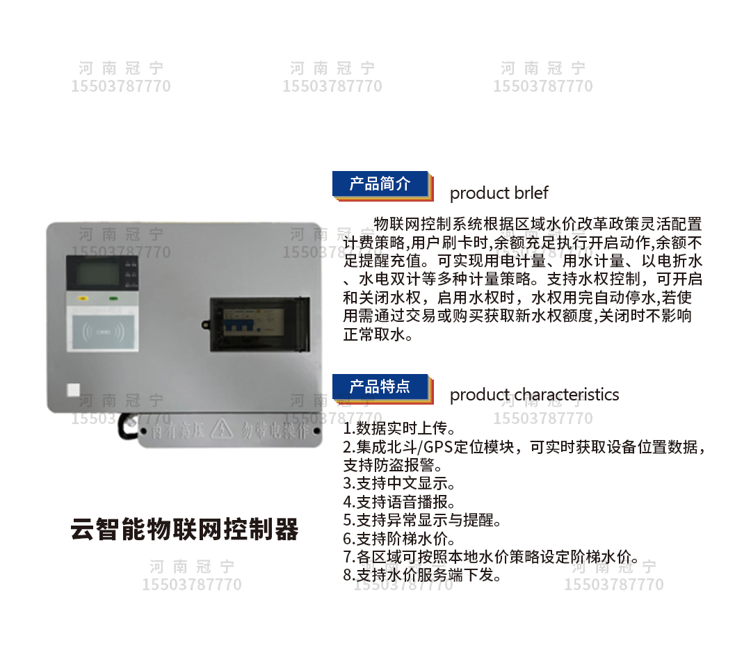 水电双计量控制器是农业机井灌溉管理系统中的核心设备,它同交流接触器、配电设备安装在一个机箱内,可以采集灌溉用电量、用水量或灌溉时间并自动收取灌溉费用。机井灌溉控制器不仅使管理部门实现了先收费、后灌溉的管理目标:也使农户达到了借助1C卡自主浇地的目的。该产品成功解决了农业机井灌溉管理中长期存在的电养/水荔计量不准、拖欠灌溉费用和浪费水资源的难题。 机井灌溉控制器是专为农业灌溉设计的高新技术产品,它将微电脑控制器、电能表、交流接触器及电动机保护器等安装在一个机箱内,以射频卡为媒介,用户划卡洛地,在微电脑的控制下,完成农业灌溉。该产品技术领先、功能完备、安装便捷、使用方便。 机井灌溉控制器成功解决了农村井灌区长期存在的电费、水费计量不准、拖欠及人为浪费严重的现象,提高了水资源的利用效率,实现了灌溉管理自动化,推进了水利现代化的进程。 1.计量方式有4种可供选择,1计时2计电3计水4水电双计量先充值,后用水;多用水,多掏钱;卡内剩余费用为0,自动停泵 控制箱实现无人值守,每张卡录有每个用户的基本信息,用户只需带一张卡就可以刷卡浇地发卡售水的部门可以对记录生成报表,方便水利局进行统一管理。
