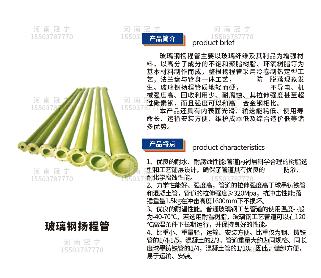 玻璃钢扬程管主要以玻璃纤维及其制品为增强材料,以高分子成分的不饱和聚脂树脂、环氧树脂等为基本材料制作而成,整根扬程管采用冷卷制热定型工艺,法兰盘与管身一体工艺,有效的防止脱落现象发生。玻璃钢扬程管质地轻而硬,耐高温、不导电、机械强度高、回收利用少、耐腐蚀、其拉伸强度甚至超过碳素钢,而且强度可以和高级合金钢相比。